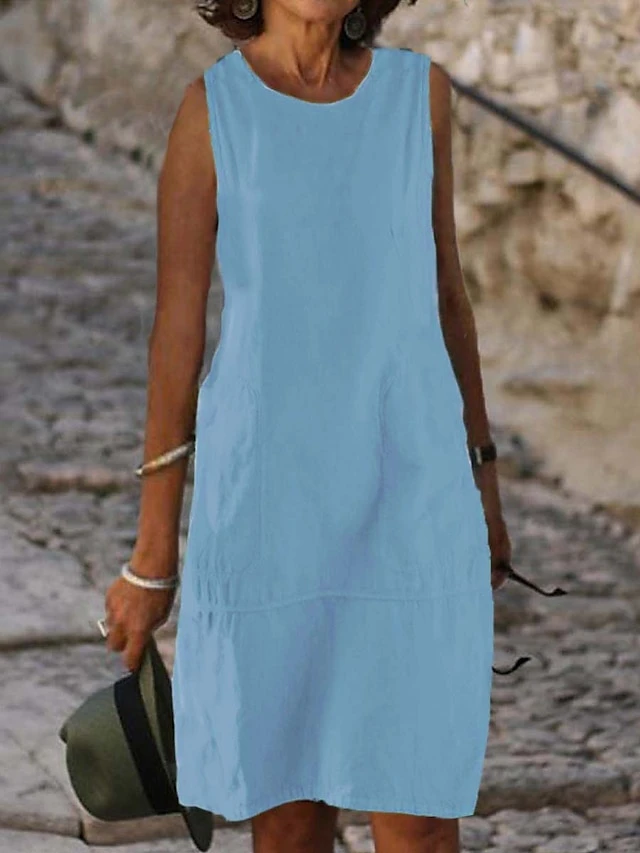 Women’s Casual Dress Cotton Dress Shift Dress Midi Dress Cotton Blend Fashion Basic Outdoor Daily Vacation U Neck Pocket Sleeveless Summer Spring Fall 2023 Loose Fit Light Blue Black White Plain S M