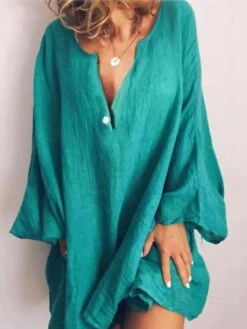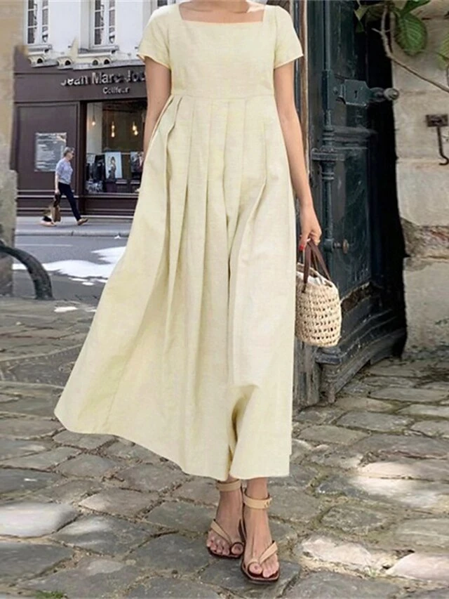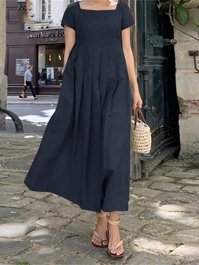 Women’s Casual Dress Cotton Linen Dress A Line Dress Maxi Long Dress Cotton Blend Basic Casual Daily Holiday Date Square Neck Ruched Smocked Short Sleeve Summer Spring 2023 Loose Fit Army Green Navy