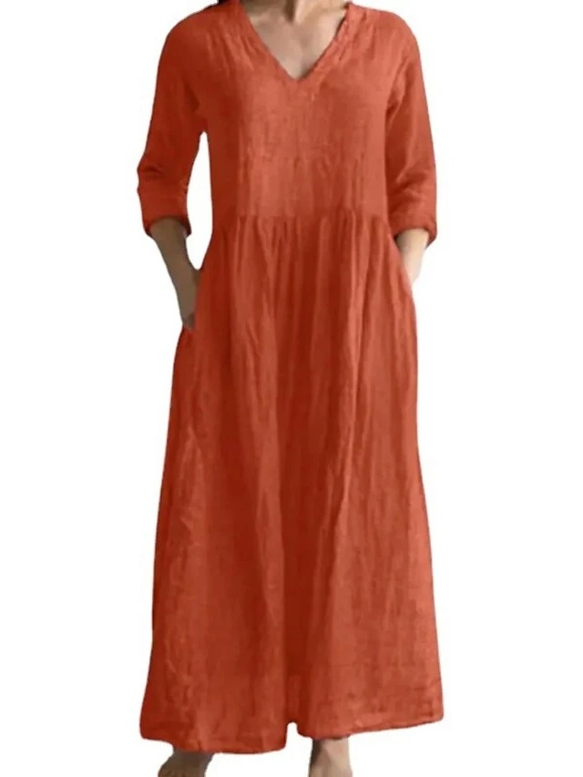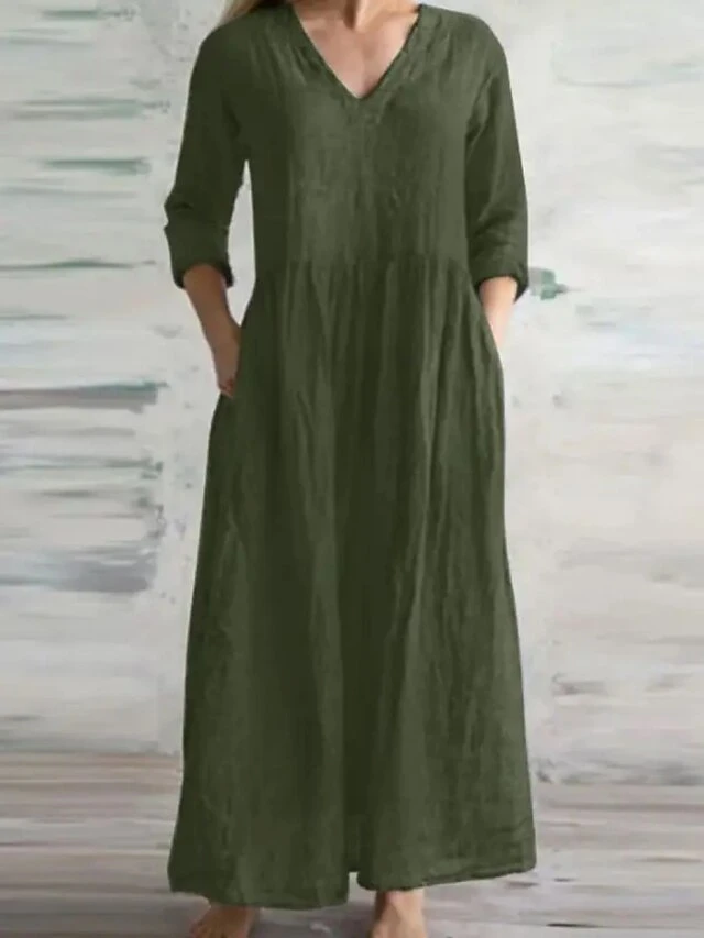 Women’s Casual Dress Cotton Linen Dress A Line Dress Maxi Long Dress Cotton Blend Fashion Modern Outdoor Daily Vacation V Neck Ruched Side Pockets 3/4 Length Sleeve Summer Spring Fall 2023 Regular Fit