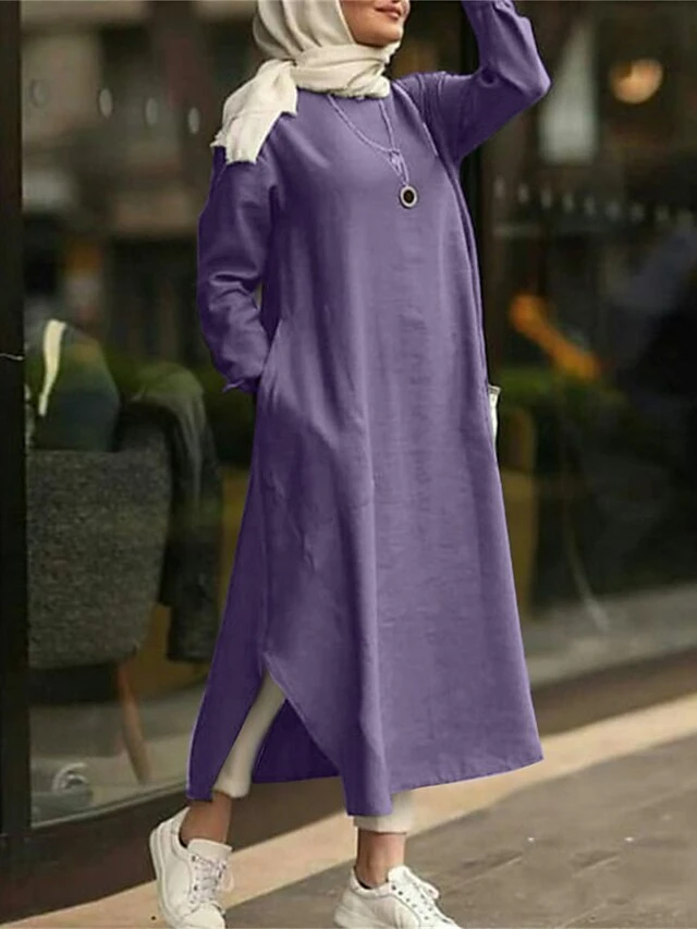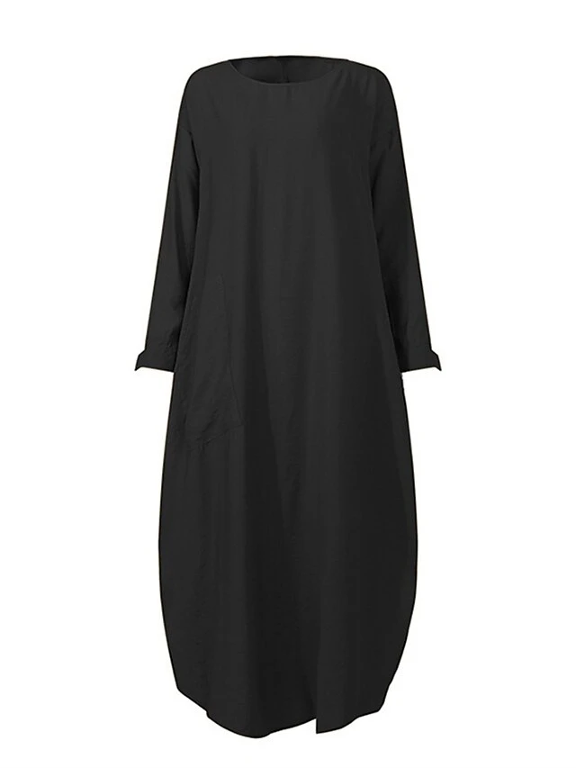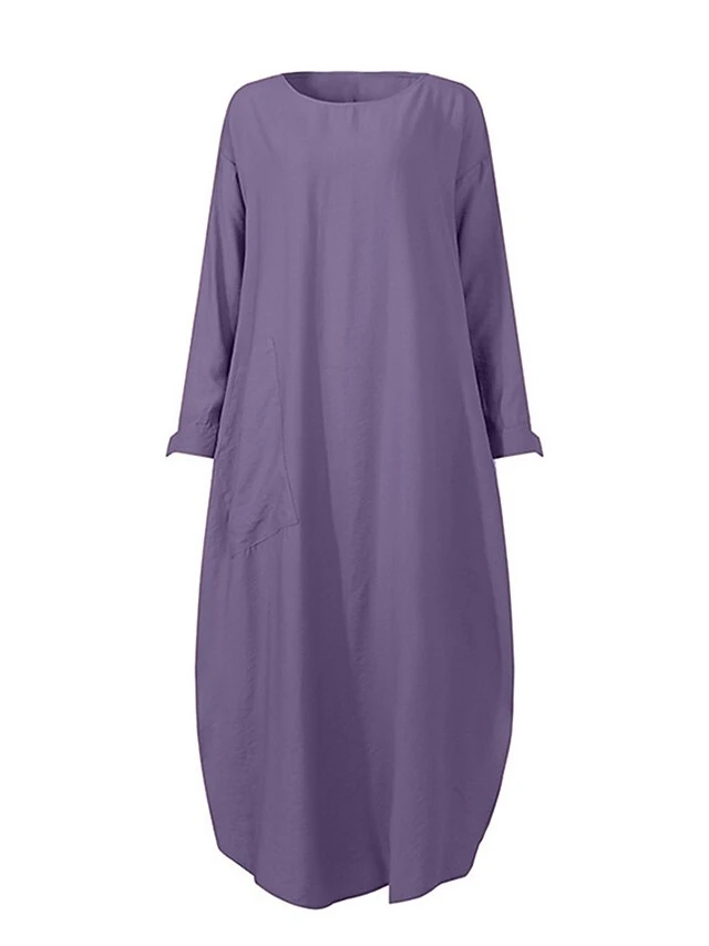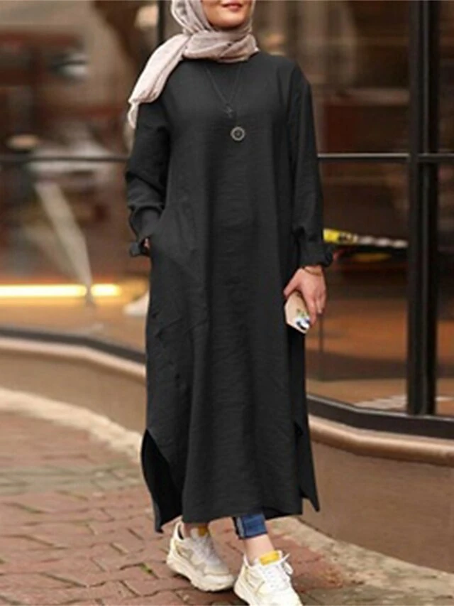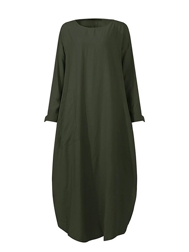 Women’s Casual Dress Cotton Linen Dress Abaya Maxi Long Dress Linen / Cotton Blend Classic Casual Outdoor Daily Vacation Crew Neck Pocket Split Long Sleeve Spring Fall Winter 2023 Loose Fit ArmyGreen