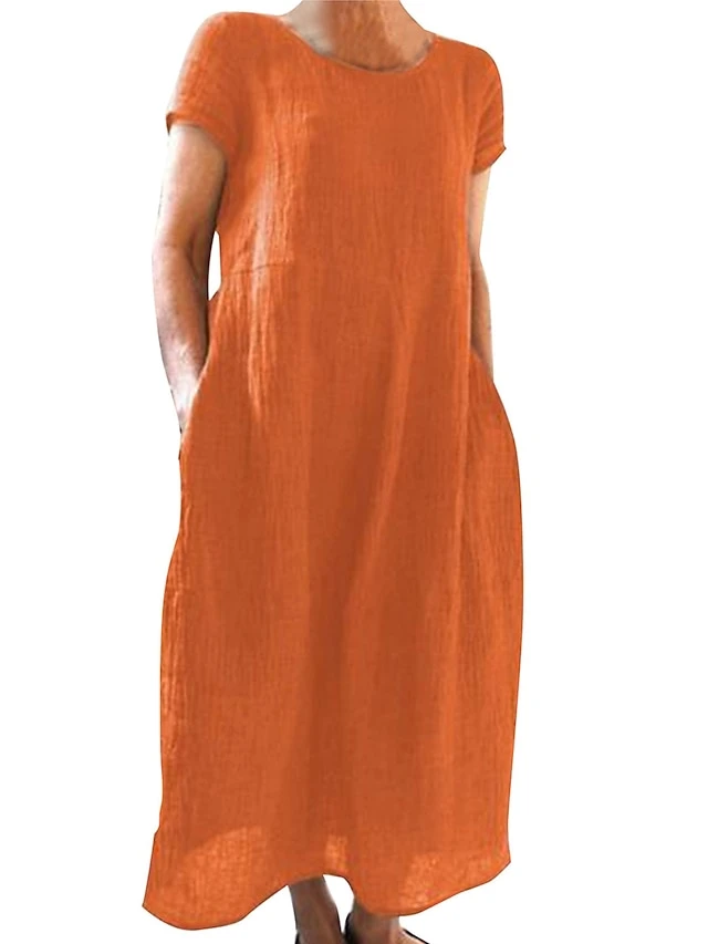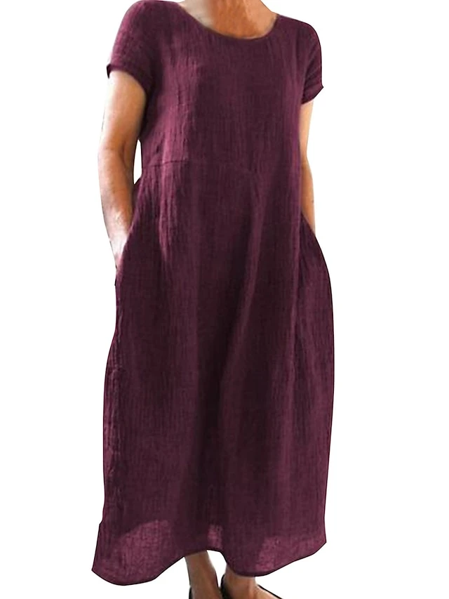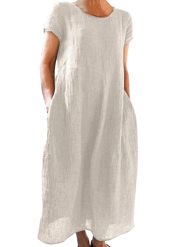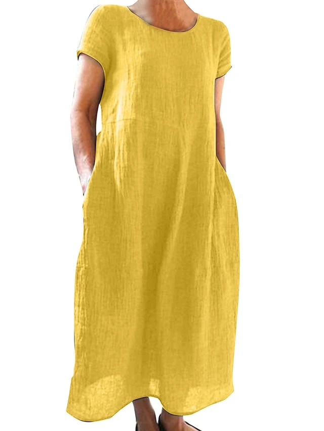 Women’s Casual Dress Cotton Linen Dress Shift Dress Maxi Long Dress Cotton Blend Basic Casual Outdoor Daily Vacation Crew Neck Pocket Short Sleeve Summer Spring 2023 Loose Fit Black White Yellow Plain