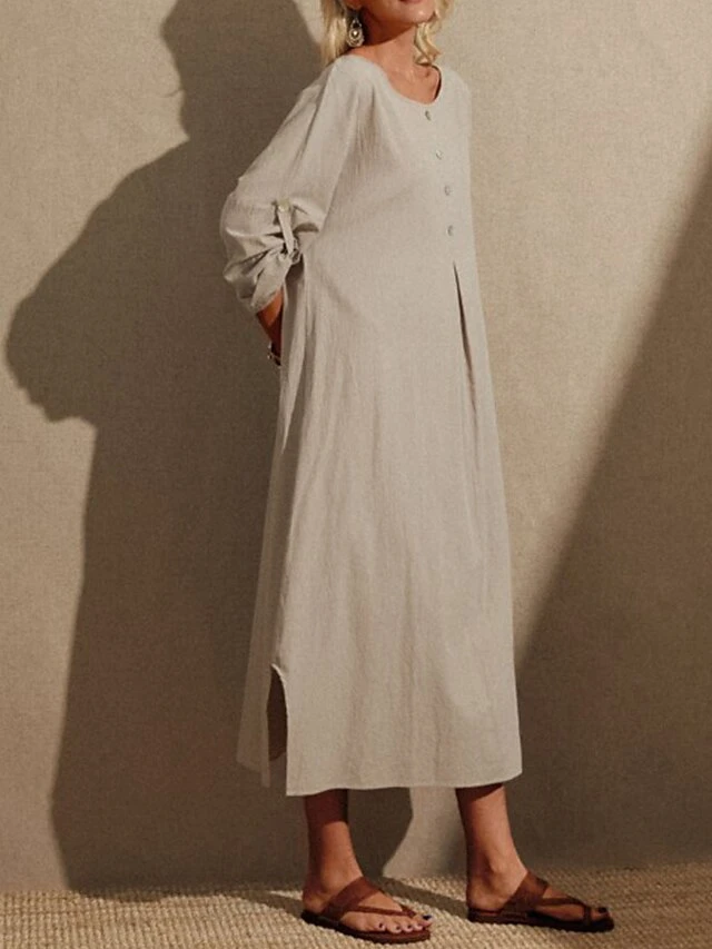 Women’s Casual Dress Cotton Linen Dress Shift Dress Maxi Long Dress Linen / Cotton Blend Daily Casual Daily Outdoor Daily Date Crew Neck Button Long Sleeve Spring Fall Winter 2023 Loose Fit Khaki
