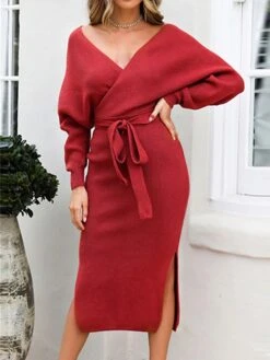 Women‘s Christmas Sweater Dress Jumper Dress Winter Dress Fashion Outdoor Christmas Street Daily V Neck Long Sleeve Lace Up Split 2023 Slim Black Red Fuchsia S M L XL