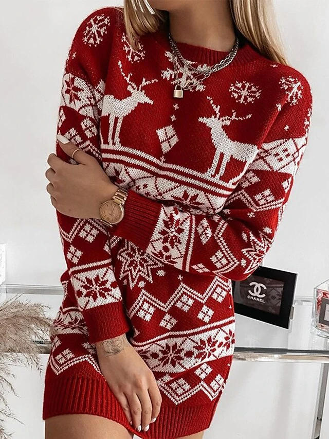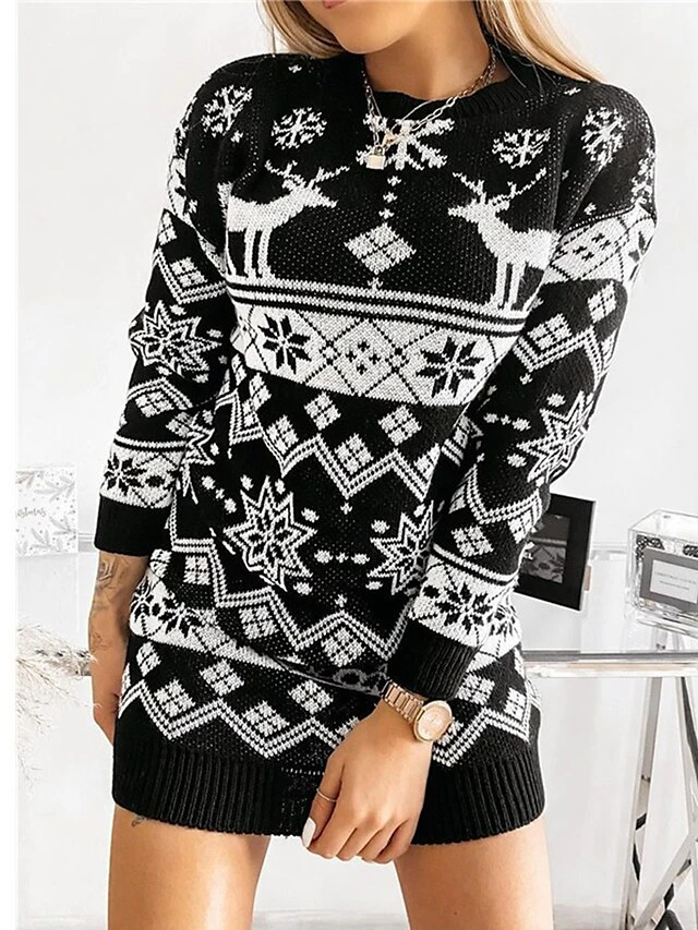 Women‘s Christmas Sweater Dress Jumper Dress Winter Dress Warm Geometric Plaid Print Outdoor Christmas Casual Daily Crew Neck Long Sleeve 2023 Loose Fit Black Red Gray S M L XL XXL