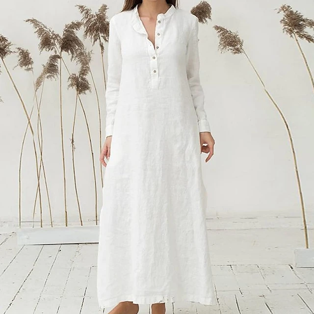 Women’s Cotton Dress Pajamas Nightgown Nighty Pure Color Retro Comfort Home Daily Stand Collar Long Sleeve Button Summer Fall Spring White Blue