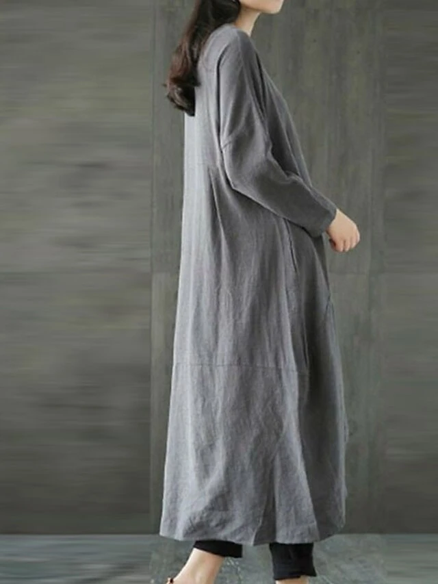 Women’s Cotton Linen Dress Casual Dress Shift Dress Maxi Long Dress Cotton Blend Casual Winter Dress Daily Going Out Crew Neck Pocket Layered Long Sleeve Summer Spring Fall 2023 Loose Fit Black Green