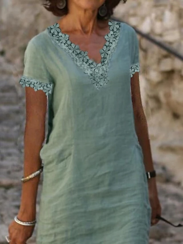 Women’s Cotton Linen Dress Casual Dress Shift Dress Midi Dress Cotton Blend Basic Casual Outdoor Daily V Neck Patchwork Short Sleeve Summer Spring 2023 Loose Fit Green Plain S M L XL 2XL