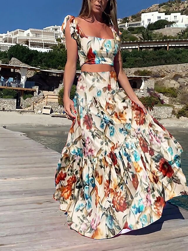Women’s Dress Set Two Piece Dress Skirt Set Long Dress Maxi Dress Yellow Fuchsia Sleeveless Floral Backless Summer Spring V Neck Vacation Slim 2023 S M L XL XXL