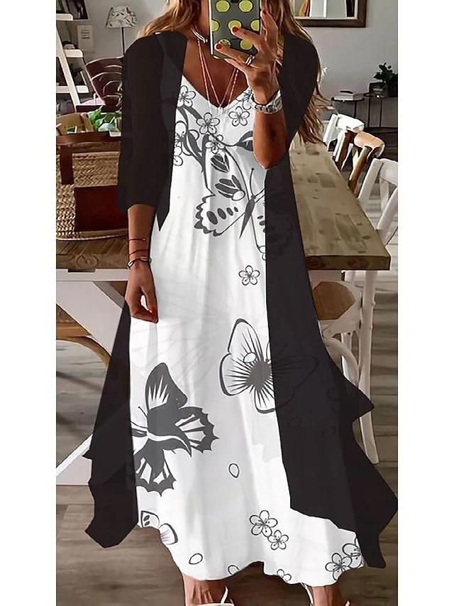 Women’s Dress Set Two Piece Dress Swing Dress Long Dress Maxi Dress Black Purple Orange Half Sleeve Floral Summer Spring V Neck Elegant Loose Fit 2023 M L XL XXL XXXL