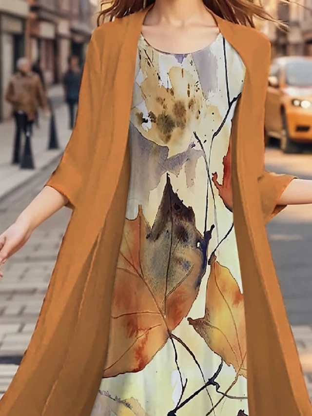 Women’s Plus Size Two Piece Dress Set Casual Dress Chiffon Dress Outdoor Office Fashion Streetwear Print Midi Dress Crew Neck 3/4 Length Sleeve Leaf Regular Fit Orange Fall Winter S M L XL XXL