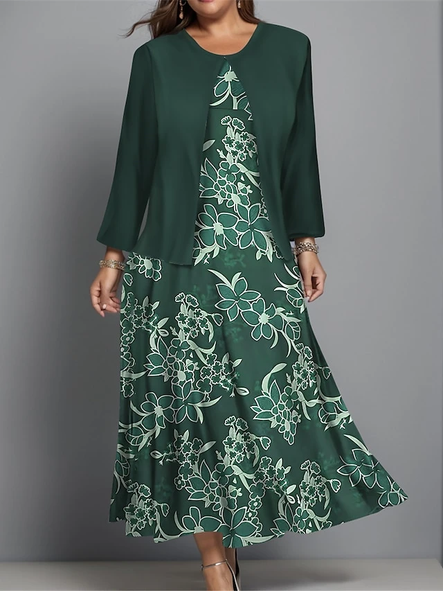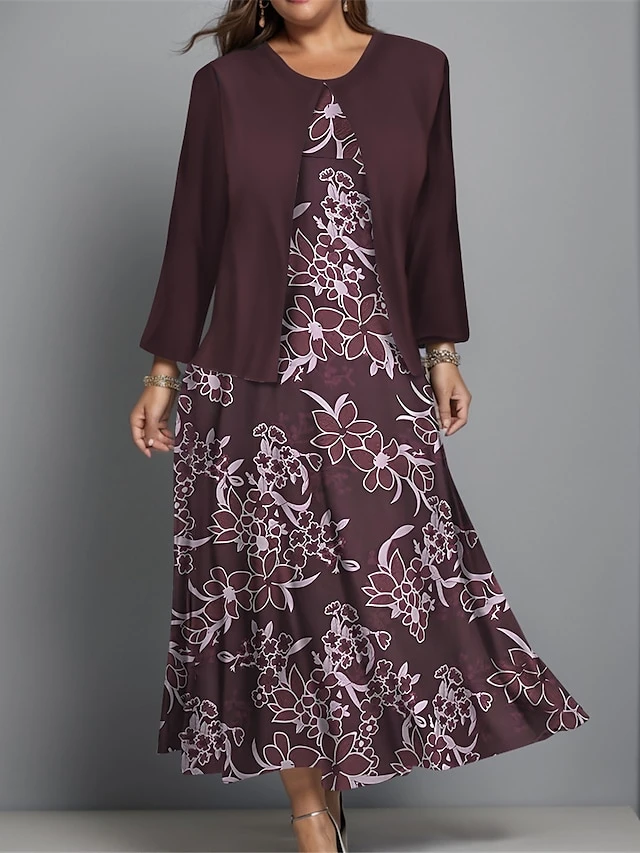 Women’s Plus Size Two Piece Dress Set Casual Dress Swing Dress Outdoor Office Fashion Streetwear Print Midi Dress Crew Neck Long Sleeve Floral Regular Fit Navy Blue Purple Green Fall Winter L XL XXL