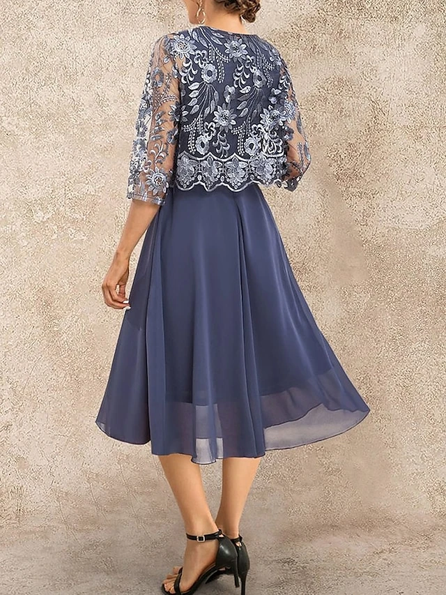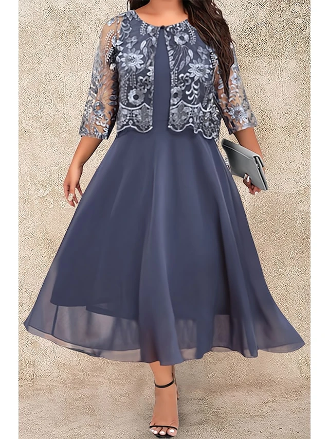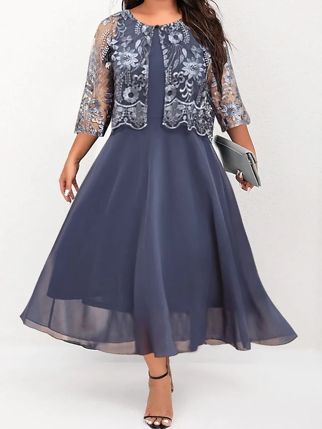 Women’s Plus Size Two Piece Dress Set Party Dress Lace Dress Party Wedding Guest Fashion Elegant Lace Patchwork Midi Dress Crew Neck 3/4 Length Sleeve Plain Regular Fit Navy Blue Fall Winter L XL XXL
