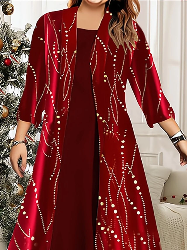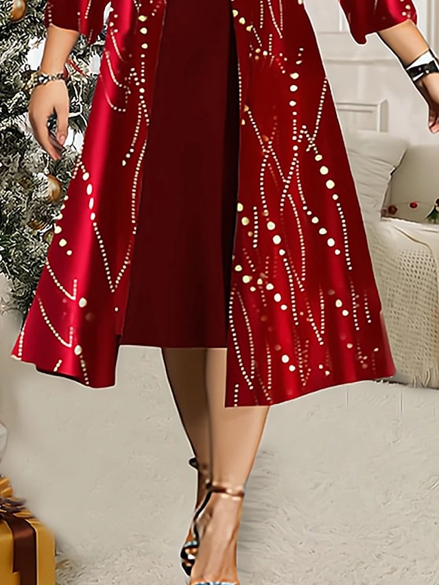 Women’s Plus Size Two Piece Dress Set Velvet Dress Party Dress Party Christmas Fashion Elegant Lace Patchwork Midi Dress Crew Neck 3/4 Length Sleeve Geometric Regular Fit Wine Fall Winter L XL XXL