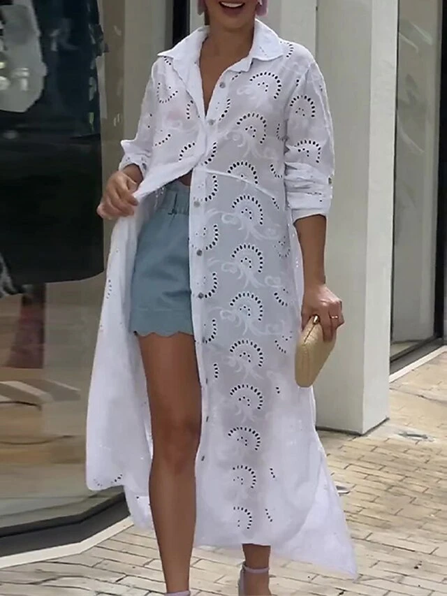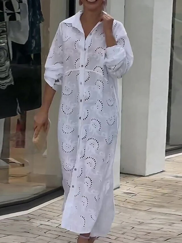 Women’s Shirt Dress Casual Dress Cotton Dress Maxi Long Dress Cotton Modern Casual Outdoor Daily Vacation Shirt Collar Hollow Out Button Long Sleeve Summer Spring Fall 2023 Loose Fit White Plain S M