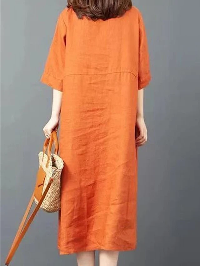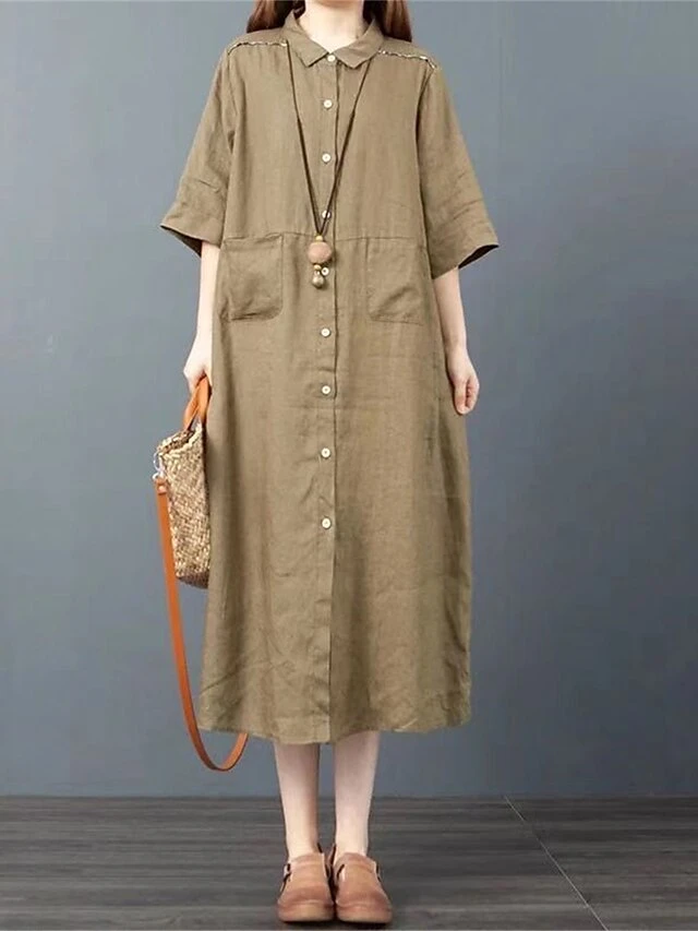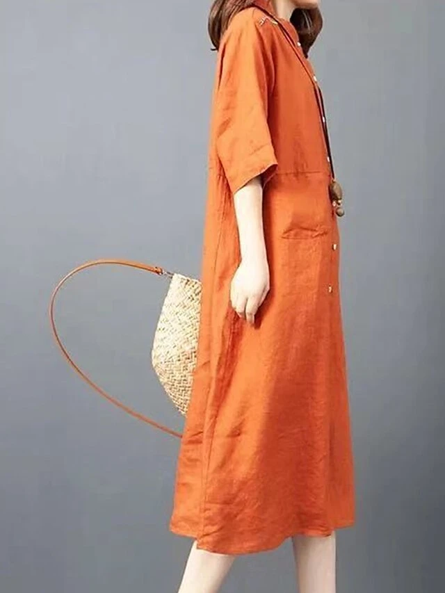 Women’s Shirt Dress Casual Dress Cotton Dress Midi Dress Cotton Basic Classic Outdoor Daily Vacation Shirt Collar Button Pocket Half Sleeve Spring Fall Winter 2023 Loose Fit ArmyGreen Orange Plain S
