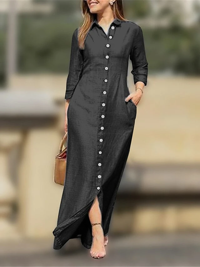 Women’s Shirt Dress Casual Dress Maxi Long Dress Outdoor Daily Cotton Linen Basic Classic Shirt Collar Button Pocket Long Sleeve Summer Spring Fall 2023 Loose Fit Black White Green Pure Color S M L