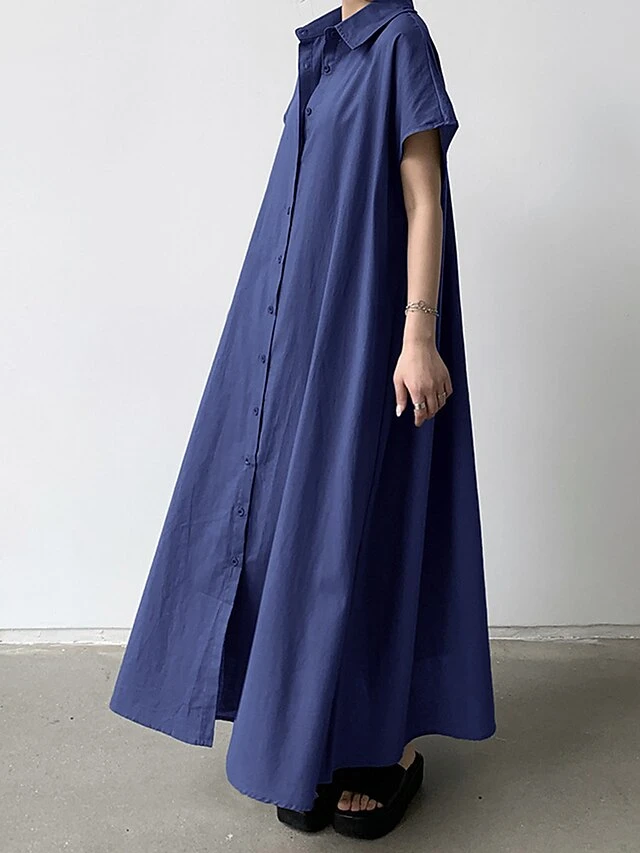 Women’s Shirt Dress Casual Dress Maxi Long Dress Outdoor Daily Cotton Linen Basic Classic Shirt Collar Button Short Sleeve Summer Spring 2023 Loose Fit Navy Blue Brown Green Pure Color S M L XL XXL