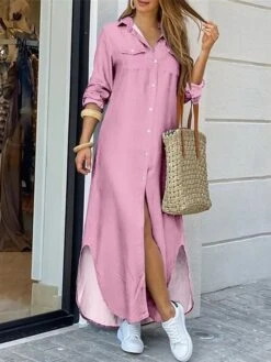 Women’s Shirt Dress Casual Dress Maxi Long Dress Outdoor Daily Vacation Polyester Fashion Classic Shirt Collar Button Pocket Long Sleeve Spring Fall Winter 2023 Regular Fit Black Pink Wine Plain S M