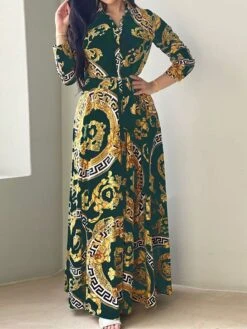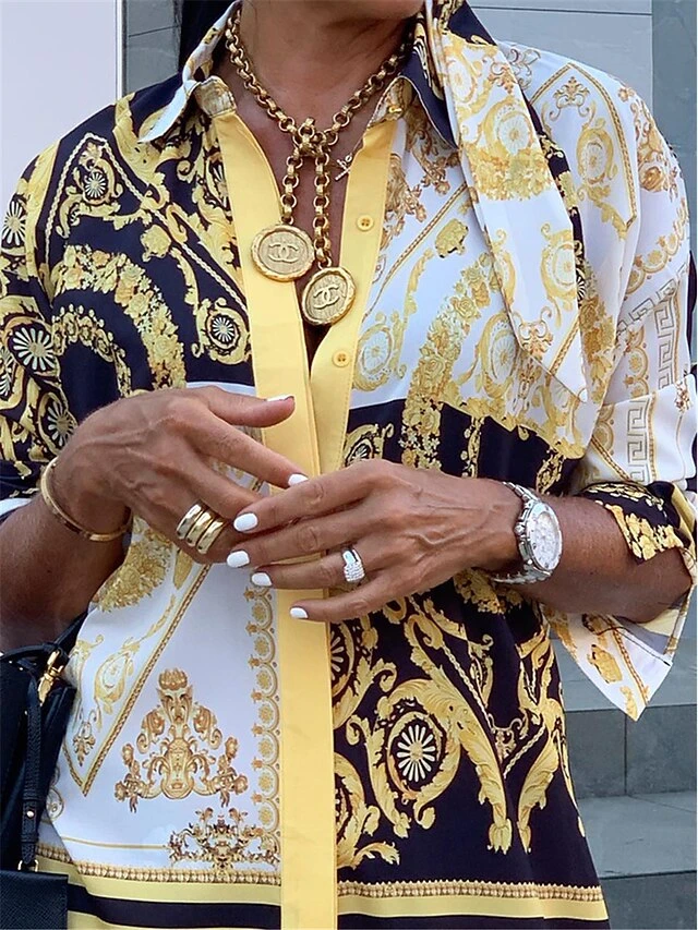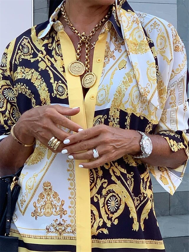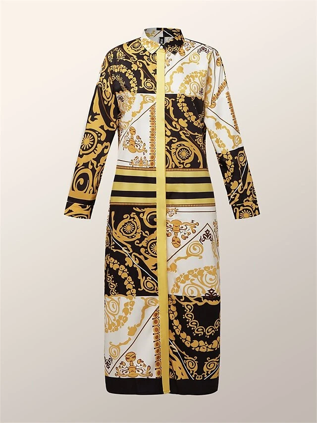 Women’s Shirt Dress Casual Dress Maxi Long Dress Outdoor Daily Vacation Polyester Vintage Retro Shirt Collar Button Print Long Sleeve Fall Winter 2023 Loose Fit Yellow Color Block Tribal Ethnic S M L