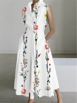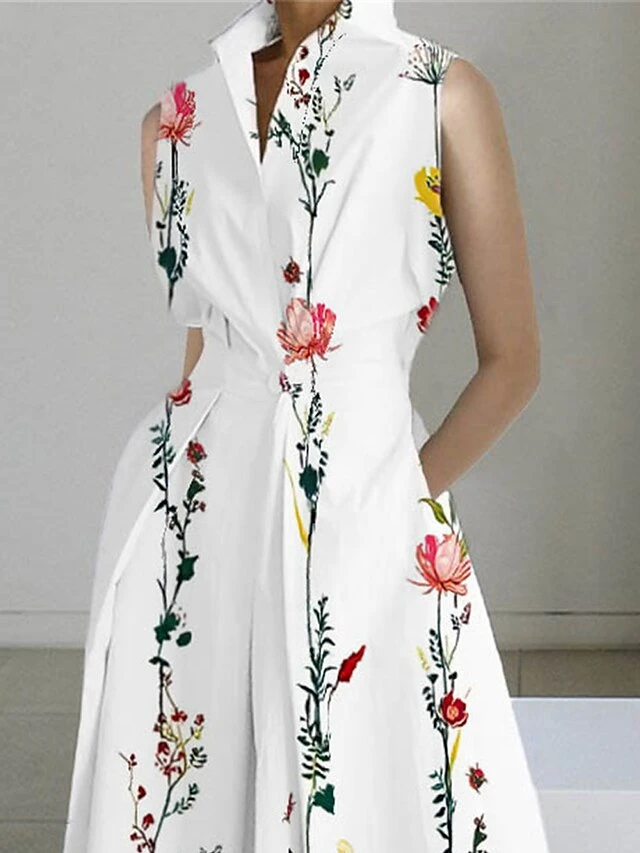 Women’s Shirt Dress Casual Dress Maxi Long Dress Outdoor Office Business Polyester Fashion Modern Shirt Collar Button Pocket Sleeveless Summer Spring 2023 Regular Fit White Pink Blue Floral S M L XL