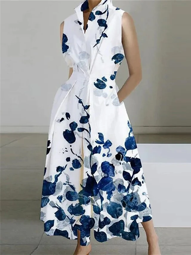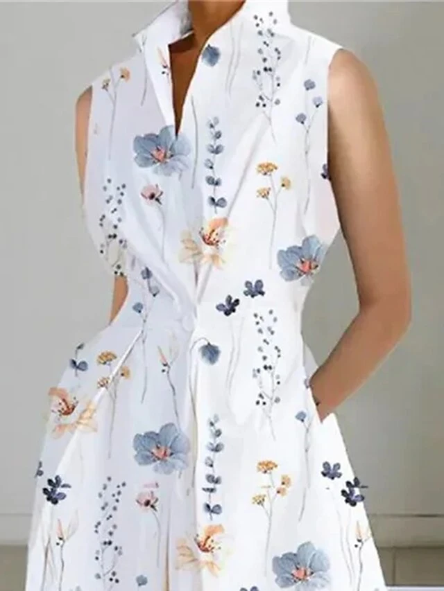 Women’s Shirt Dress Casual Dress Midi Dress Outdoor Office Daily Cotton Fashion Modern Split Neck Button Pocket Sleeveless Summer Spring 2023 Loose Fit White Blue Leaf Polka Dot S M L XL XXL