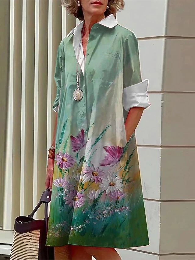 Women’s Shirt Dress Casual Dress Midi Dress Outdoor Office Daily Polyester Fashion Modern Shirt Collar Button Pocket Long Sleeve Fall Winter 2023 Loose Fit ArmyGreen White Blue Floral S M L XL 2XL