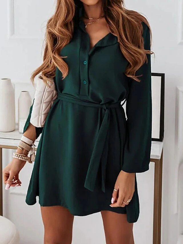 Women’s Shirt Dress Casual Dress Mini Dress Outdoor Daily Date Cotton Fashion Modern Shirt Collar Lace Up Button Long Sleeve Fall Winter 2023 Loose Fit Wine Brown Green Plain S M L XL 2XL