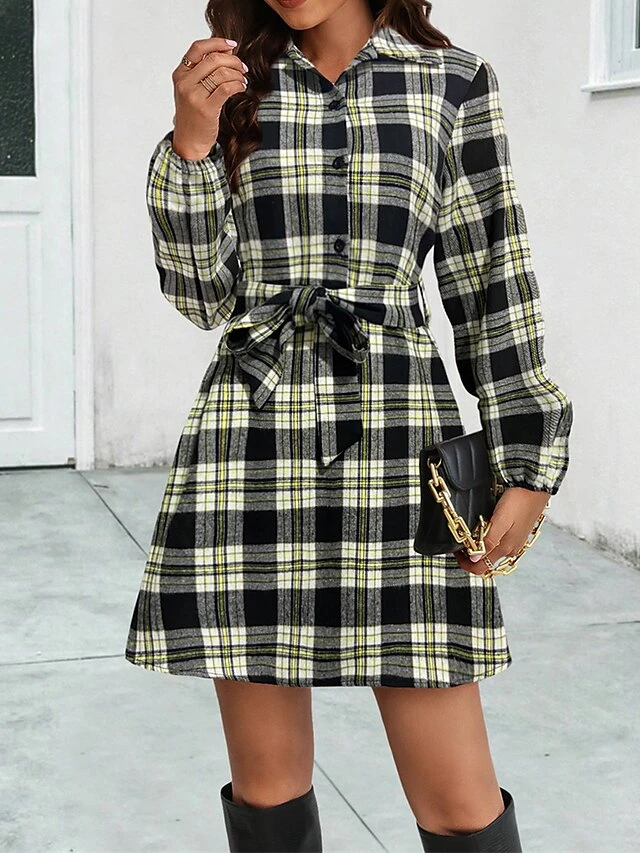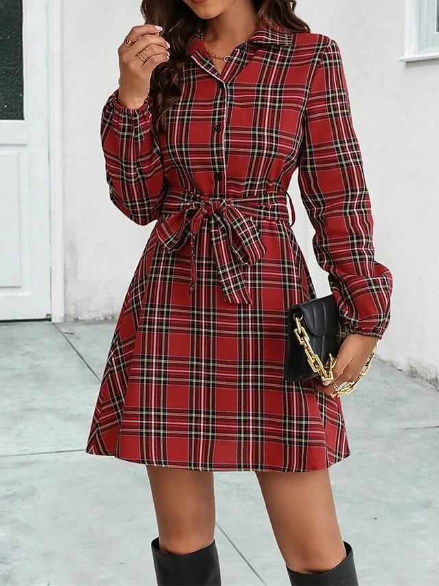 Women’s Shirt Dress Casual Dress Mini Dress Outdoor Daily Date Polyester Fashion Casual Shirt Collar Lace Up Button Long Sleeve Spring Fall Winter 2023 Loose Fit Black Red Plaid S M L XL