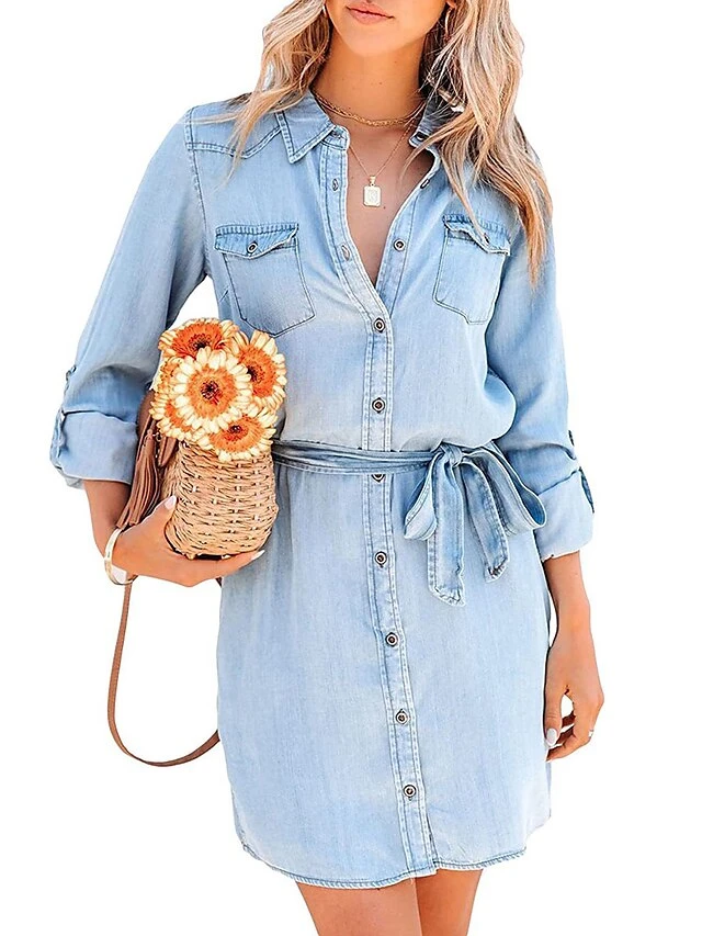 Women’s Shirt Dress Casual Dress Mini Dress Outdoor Daily Denim Fashion Modern Shirt Collar Lace Up Button Long Sleeve Fall Winter 2023 Loose Fit Navy Blue Blue Pure Color S M L XL
