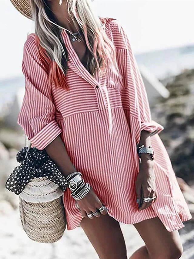 Women’s Shirt Dress Casual Dress Mini Dress Outdoor Daily Vacation Polyester Fashion Modern Shirt Collar Button Pocket 3/4 Length Sleeve Spring Fall Winter 2023 Loose Fit Red Blue Striped S M L XL XXL