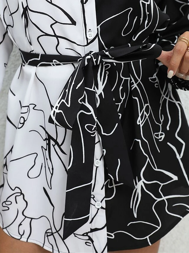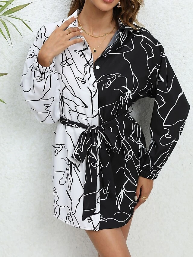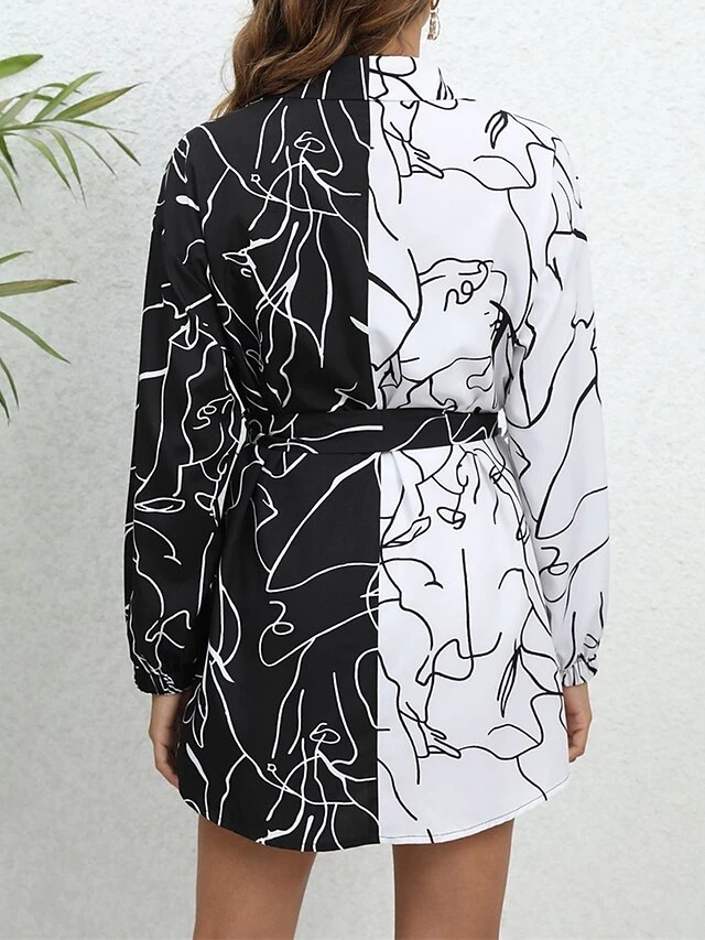 Women’s Shirt Dress Casual Dress Mini Dress Outdoor Daily Vacation Polyester Fashion Modern Shirt Collar Lace Up Button Long Sleeve Spring Fall Winter 2023 Loose Fit White Abstract Portrait S M L XL