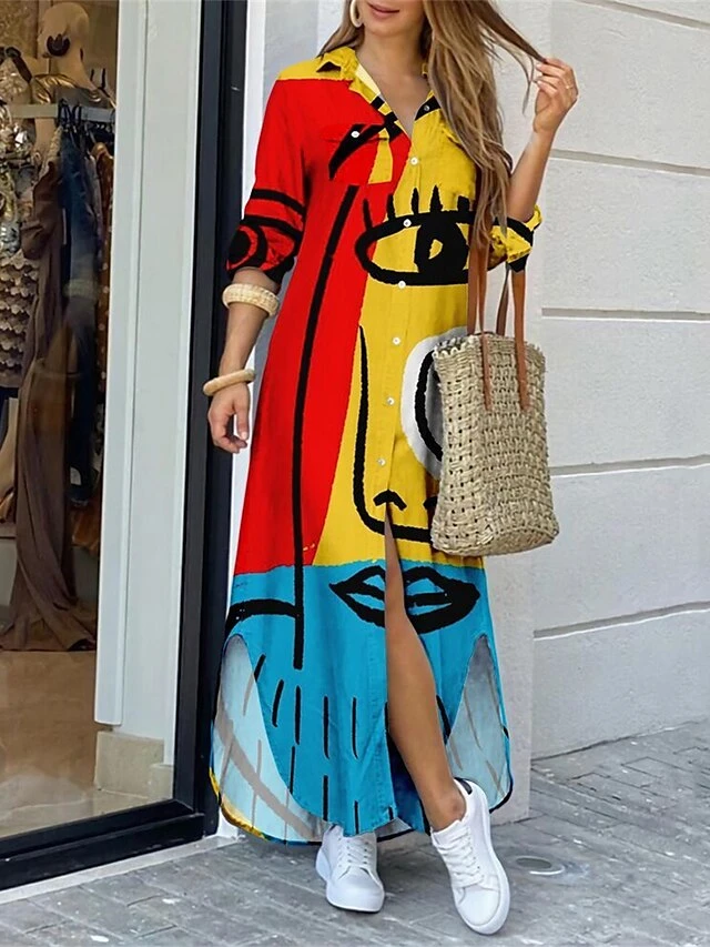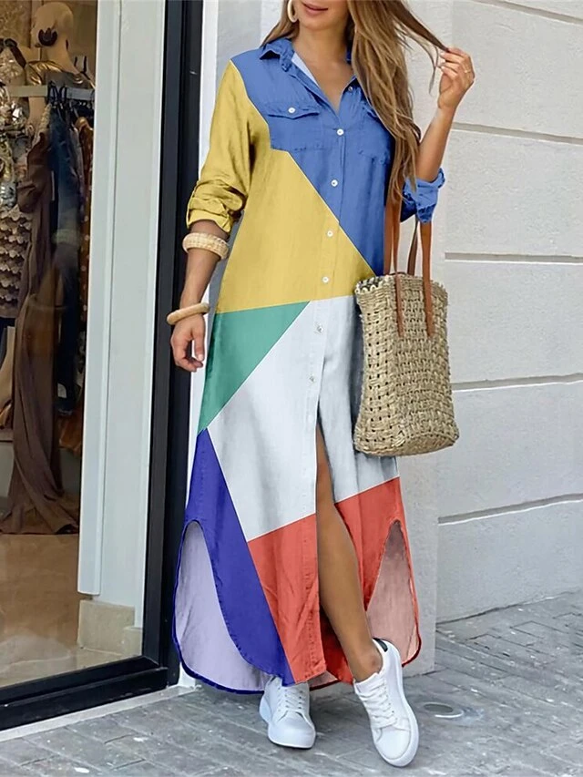 Women’s Shirt Dress Casual Dress Shift Dress Maxi Long Dress Outdoor Daily Vacation Polyester Fashion Modern Shirt Collar Button Split Long Sleeve Summer Spring Fall 2023 Regular Fit White Yellow Red