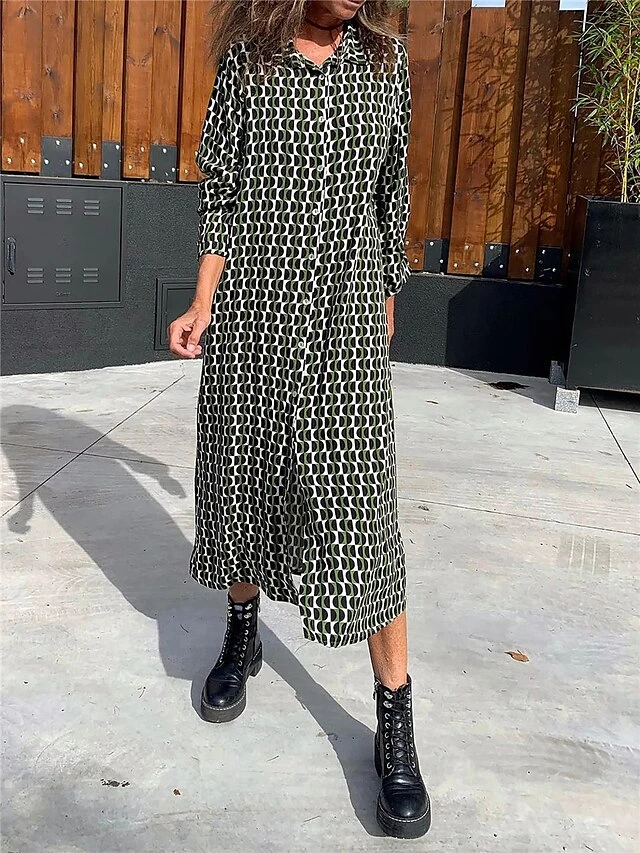Women’s Shirt Dress Casual Dress Shift Dress Midi Dress Outdoor Daily Vacation Polyester Fashion Modern Shirt Collar Button Print Long Sleeve Summer Spring Fall 2023 Regular Fit Black Geometric S M L
