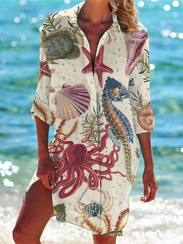 Women’s Shirt Dress Casual Dress Shift Dress Mini Dress Outdoor Daily Date Polyester Fashion Classic Shirt Collar Pocket Print Half Sleeve Summer Spring 2023 Loose Fit White Red Navy Blue Fish S M L
