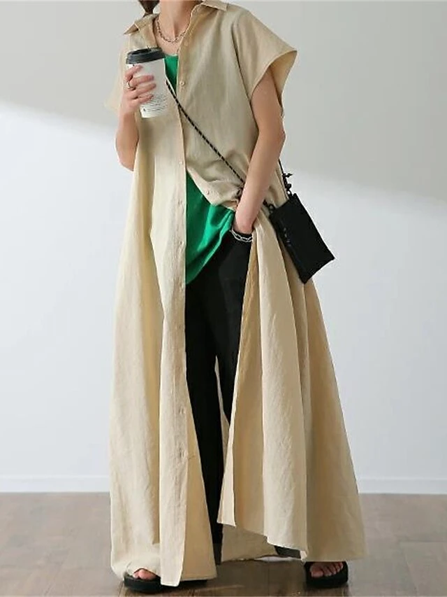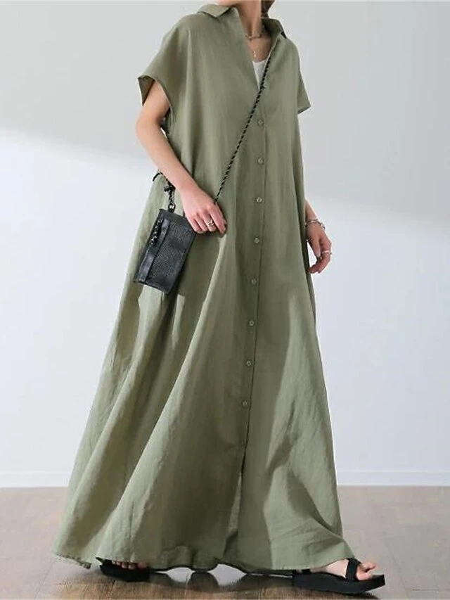 Women’s Shirt Dress Casual Dress Swing Dress Maxi Long Dress Outdoor Daily Date Polyester Fashion Modern Shirt Collar Button Short Sleeve Fall 2023 Loose Fit ArmyGreen Blue Brown Plain S M L XL