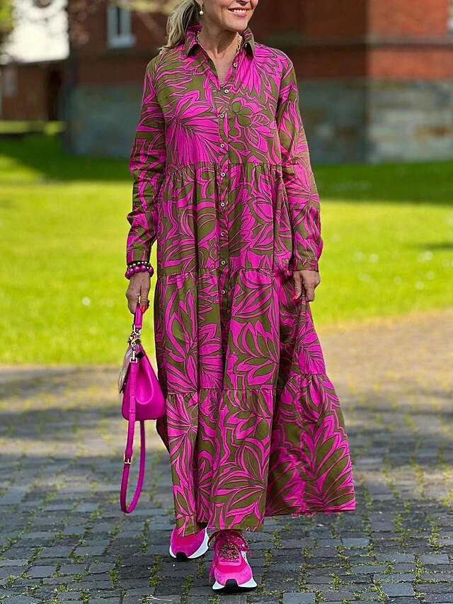 Women’s Shirt Dress Casual Dress Swing Dress Maxi Long Dress Outdoor Daily Vacation Satin Fashion Modern Shirt Collar Button Print Long Sleeve Spring Fall 2023 Loose Fit Dark Pink Floral S M L XL 2XL