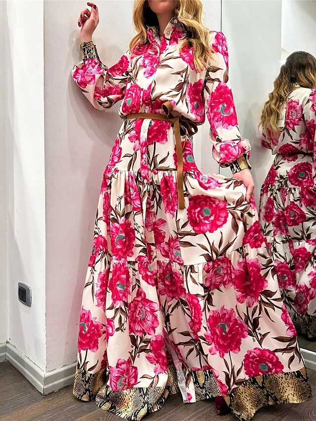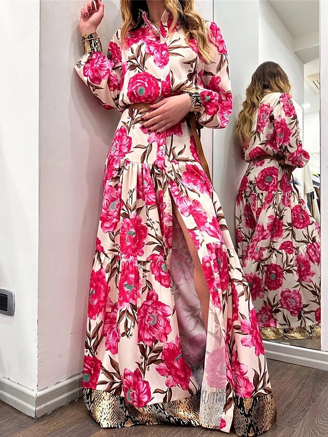 Women’s Shirt Dress Casual Dress Swing Dress Maxi Long Dress Outdoor Daily Vacation Satin Fashion Modern Shirt Collar Button Split Long Sleeve Spring Fall 2023 Loose Fit Dark Pink Floral S M L XL 2XL