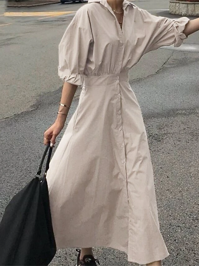 Women’s Shirt Dress Casual Dress Work Dress Maxi Long Dress Outdoor Daily Cotton Basic Classic Shirt Collar Button Long Sleeve Summer Spring Fall 2023 Loose Fit Black Sky Blue Khaki Pure Color S M L