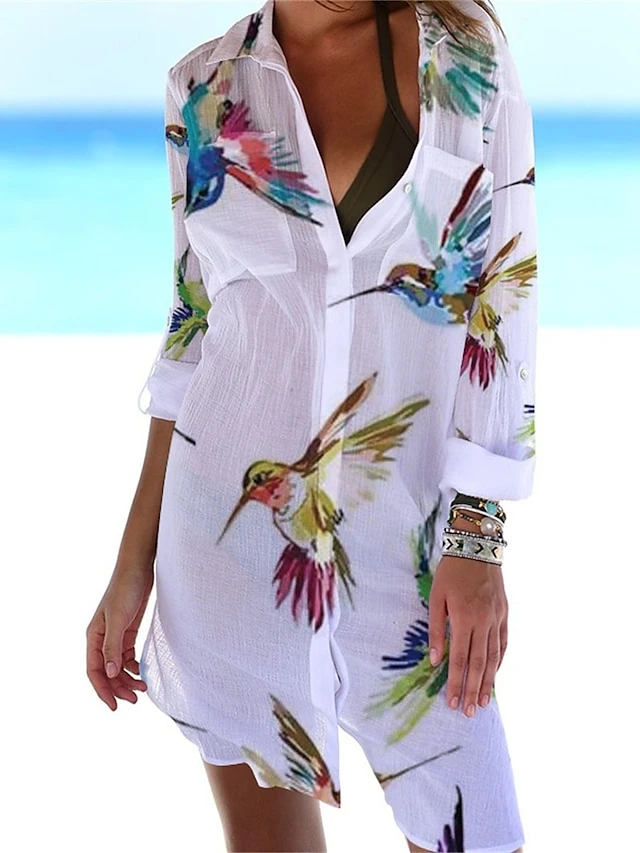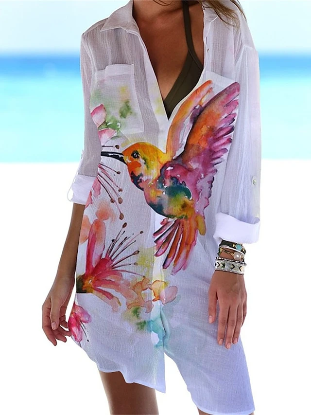 Women‘s Shirt Dress Cover Up Beach Dress Beach Wear Mini Dress Pocket Print Fashion Casual Floral Turndown 3/4 Length Sleeve Loose Fit Outdoor Daily White Yellow 2023 Spring Summer S M L XL