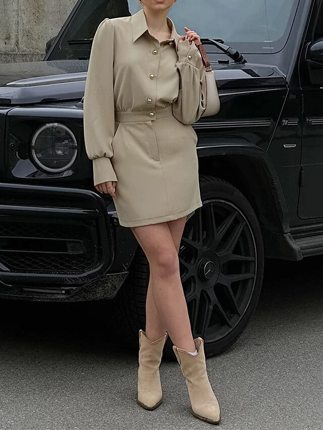 Women’s Shirt Dress Work Dress Bodycon Mini Dress Outdoor Business Date Polyester Fashion Modern Shirt Collar Button Pocket Long Sleeve Fall Winter 2023 Regular Fit Khaki Pure Color S M L