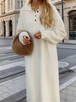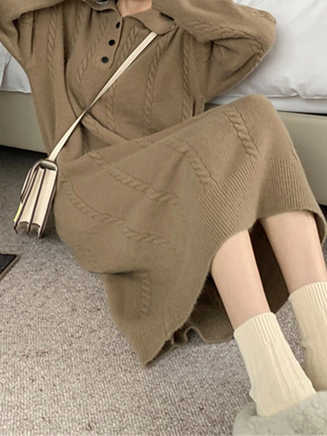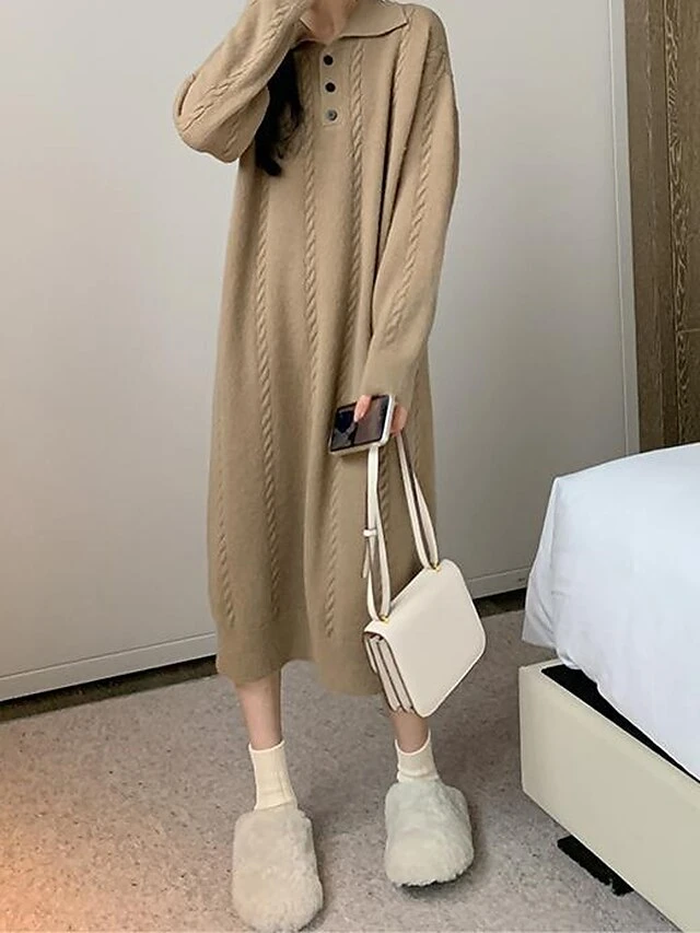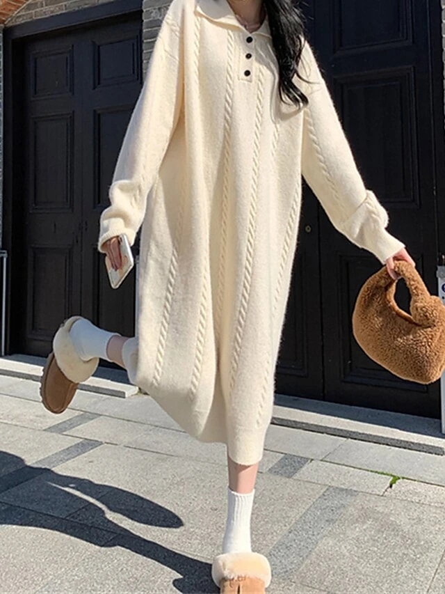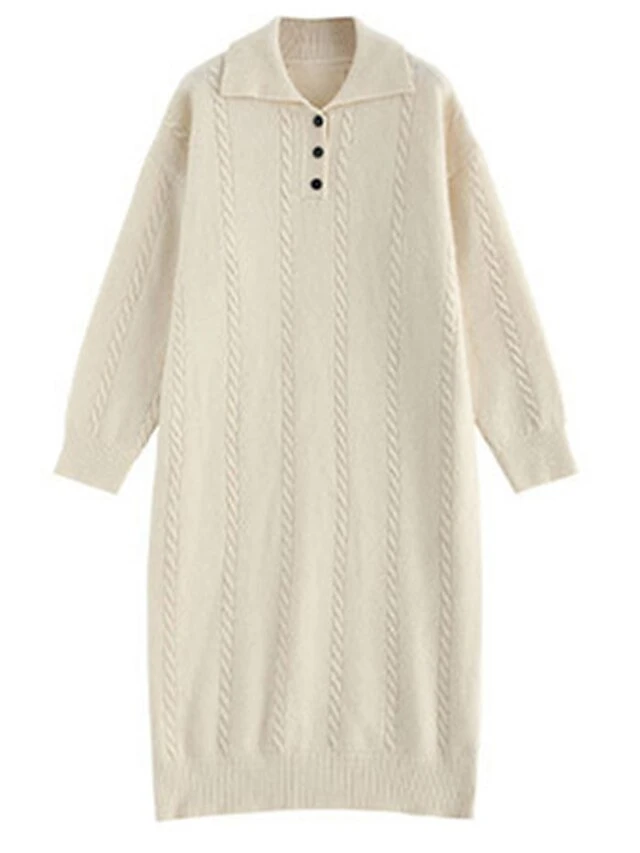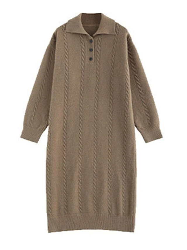 Women’s Sweater Dress Jumper Dress Casual Dress Midi Dress Fashion Pure Color Outdoor Daily Vacation Going Out Lapel Long Sleeve Patchwork Button 2023 Regular Fit White Camel One Size
