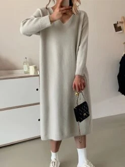 Women’s Sweater Dress Jumper Dress Casual Dress Midi Dress Fashion Pure Color Outdoor Daily Vacation Going Out V Neck Long Sleeve Patchwork 2023 Regular Fit Black White Pink One Size