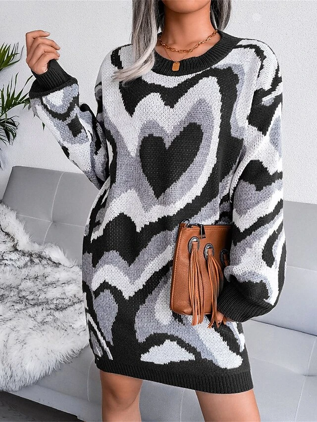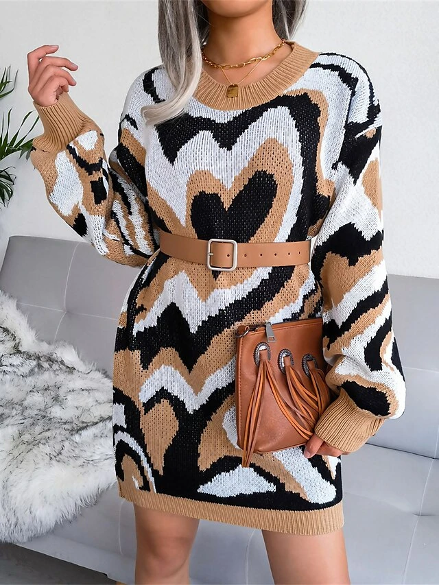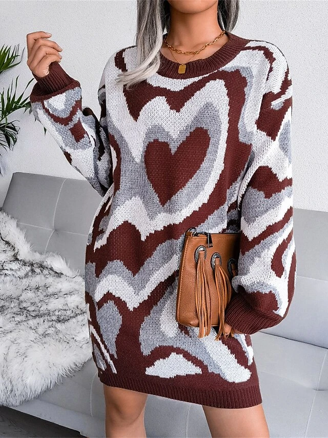 Women’s Sweater Dress Jumper Dress Casual Dress Mini Dress Fashion Color Block Heart Outdoor Daily Vacation Going Out Crew Neck Long Sleeve 2023 Loose Fit Black Brown Khaki S M L
