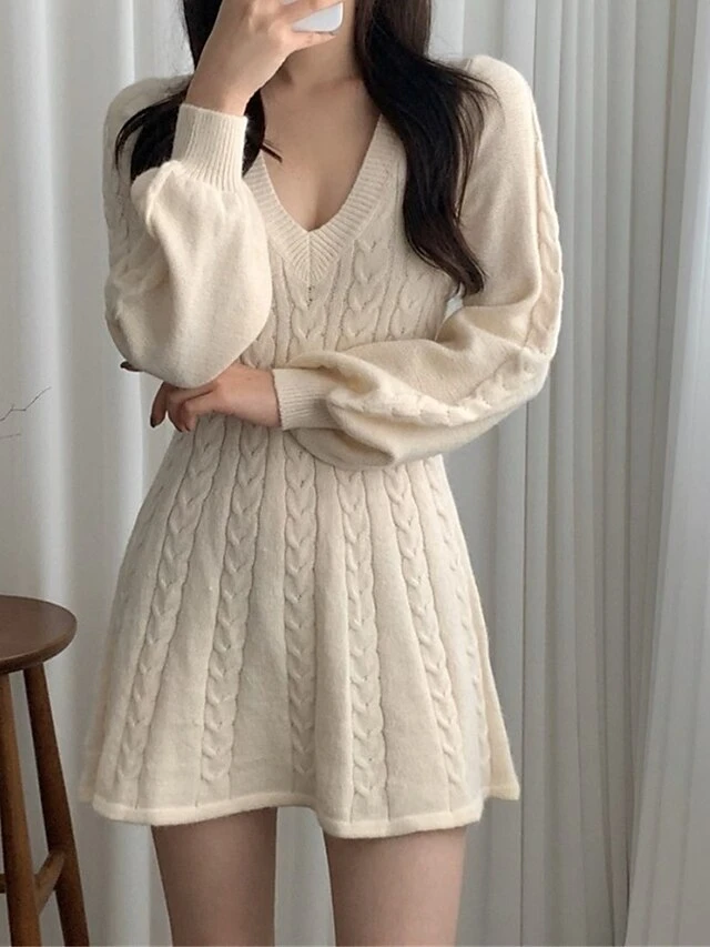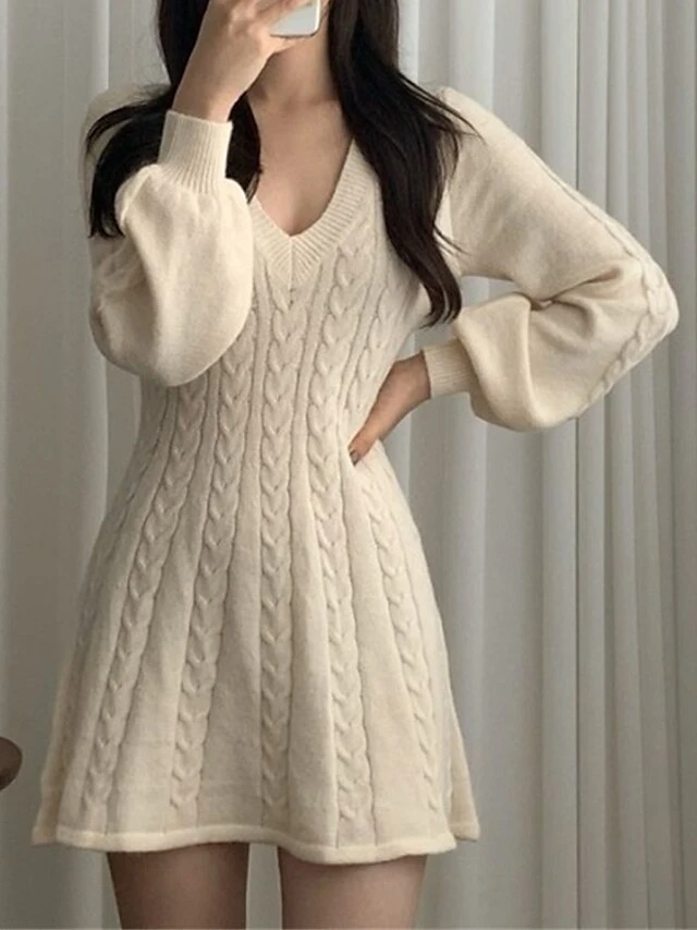 Women’s Sweater Dress Jumper Dress Casual Dress Mini Dress Fashion Pure Color Outdoor Daily Going Out V Neck Long Sleeve 2023 Regular Fit Black Pink Khaki One Size
