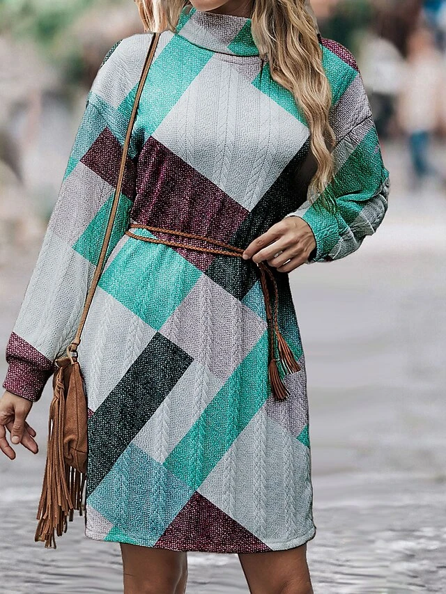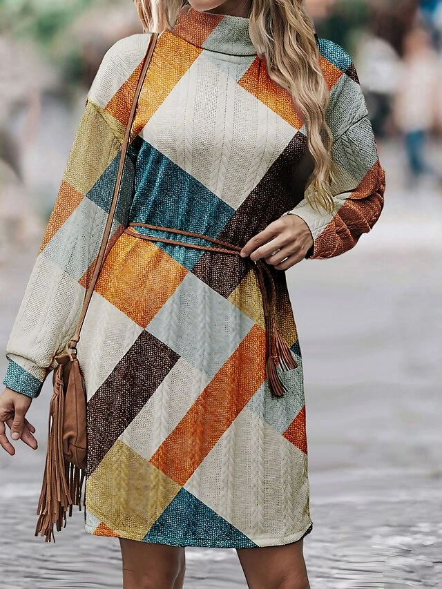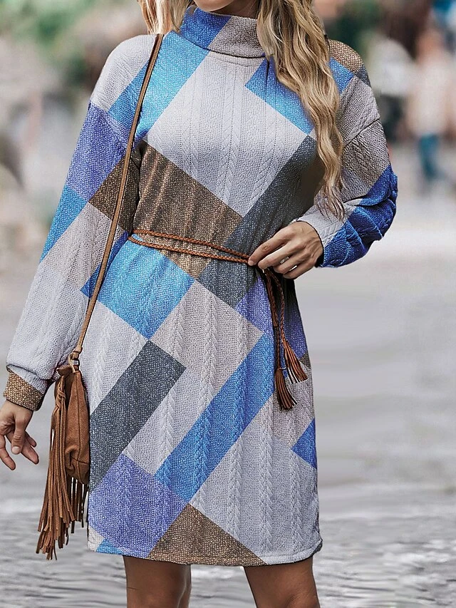Women’s Sweater Dress Jumper Dress Casual Dress Mini Dress Warm Plaid Outdoor Daily Vacation Going Out Turtleneck Long Sleeve 2023 Loose Fit Blue Orange Green S M L XL XXL 3XL