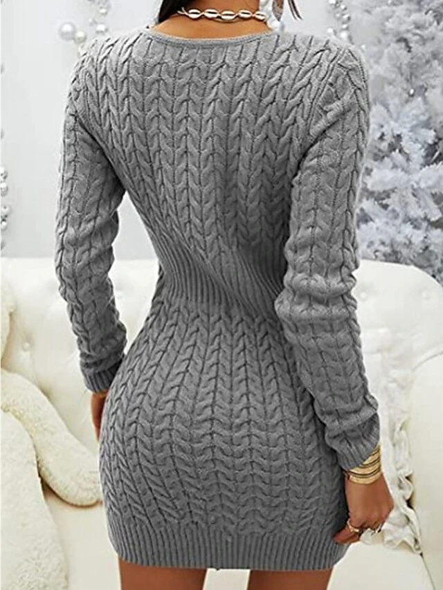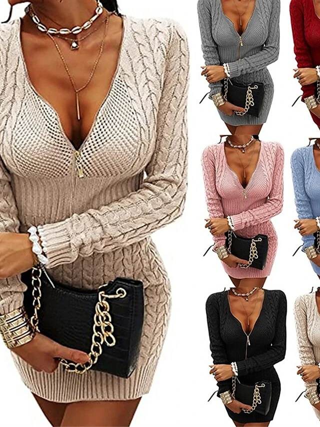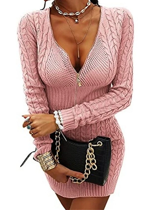 Women’s Sweater Dress Jumper Dress Sheath Dress Mini Dress Warm Pure Color Outdoor Casual Holiday Going Out V Neck Long Sleeve Zipper 2023 Slim Black White Pink S M L XL XXL 3XL