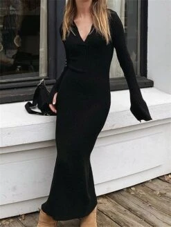 Women’s Sweater Dress Winter Dress Jumper Dress Long Dress Maxi Dress Ruched Street Daily Holiday Fashion Streetwear V Neck Long Sleeve 2023 Regular Fit Black Color S M L Size