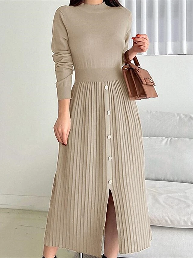 Women’s Sweater Dress Winter Dress Jumper Dress Midi Dress Pleated Button Daily Date Going Out Fashion Basic Crew Neck Long Sleeve 2023 Slim Black Brown Green Color S M L XL Size