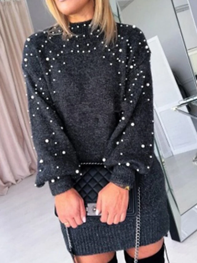 Women’s Sweater Dress Winter Dress Jumper Dress Mini Dress Pearl Daily Date Going Out Active Fashion Crew Neck Long Sleeve 2023 Loose Fit Khaki Army Green Gray Color S M L XL XXL Size
