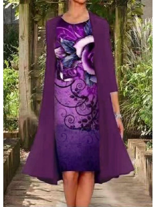 Women’s Two Piece Dress Casual Dress Dress Set Shift Dress Knee Length Dress Navy Blue Blue Lavender Long Sleeve Layered Fall Autumn Crew Neck Elegant Fall Dress 2023 M L XL XXL XXXL 4XL 5XL